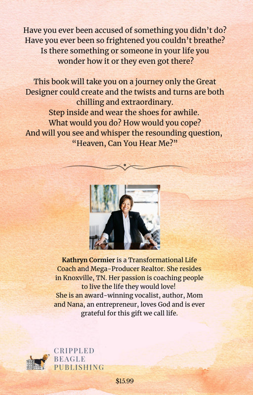 Have you ever been accused of something you didn't do? Have you ever been so frightened you couldn't breathe? Is there a something or someone in your life you wonder how it or they even got there? This book will take you on a journey only the Great Designer could create and the twists and turns are both chilling and extraordinary. Step inside and wear the shoes for awhile. What would you do? How would you cope? And will you see and whisper the resounding question "Heaven, Can You Hear Me?"